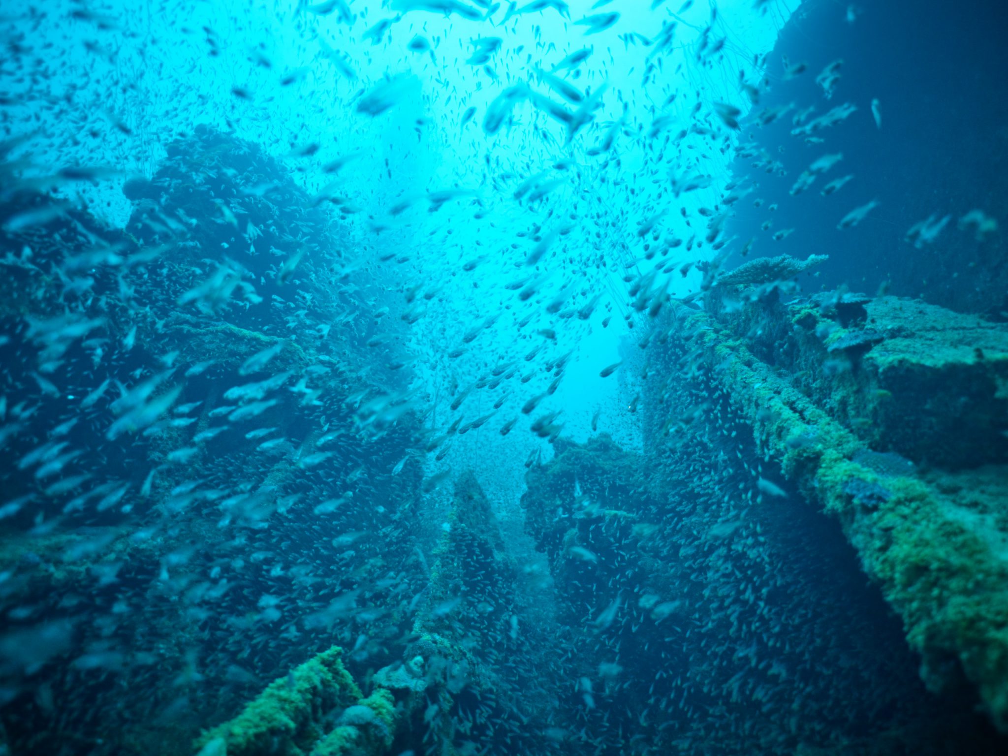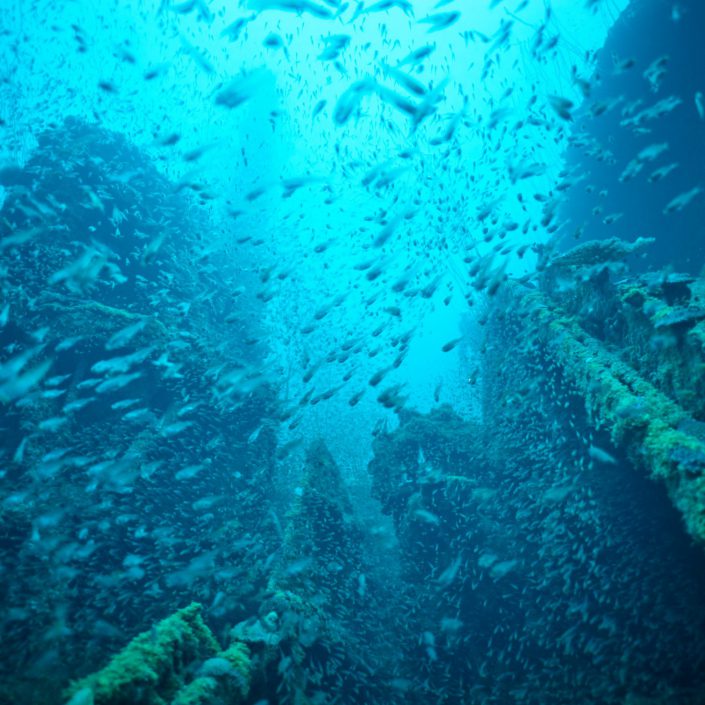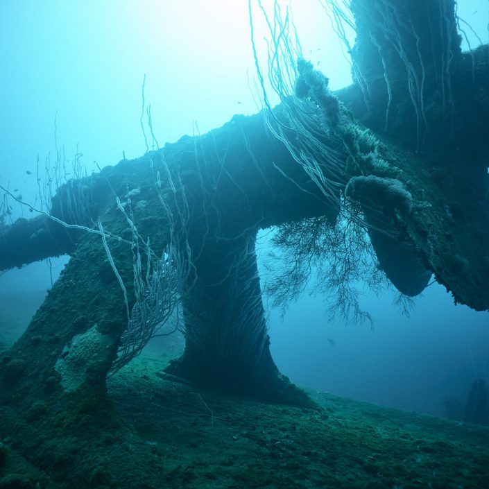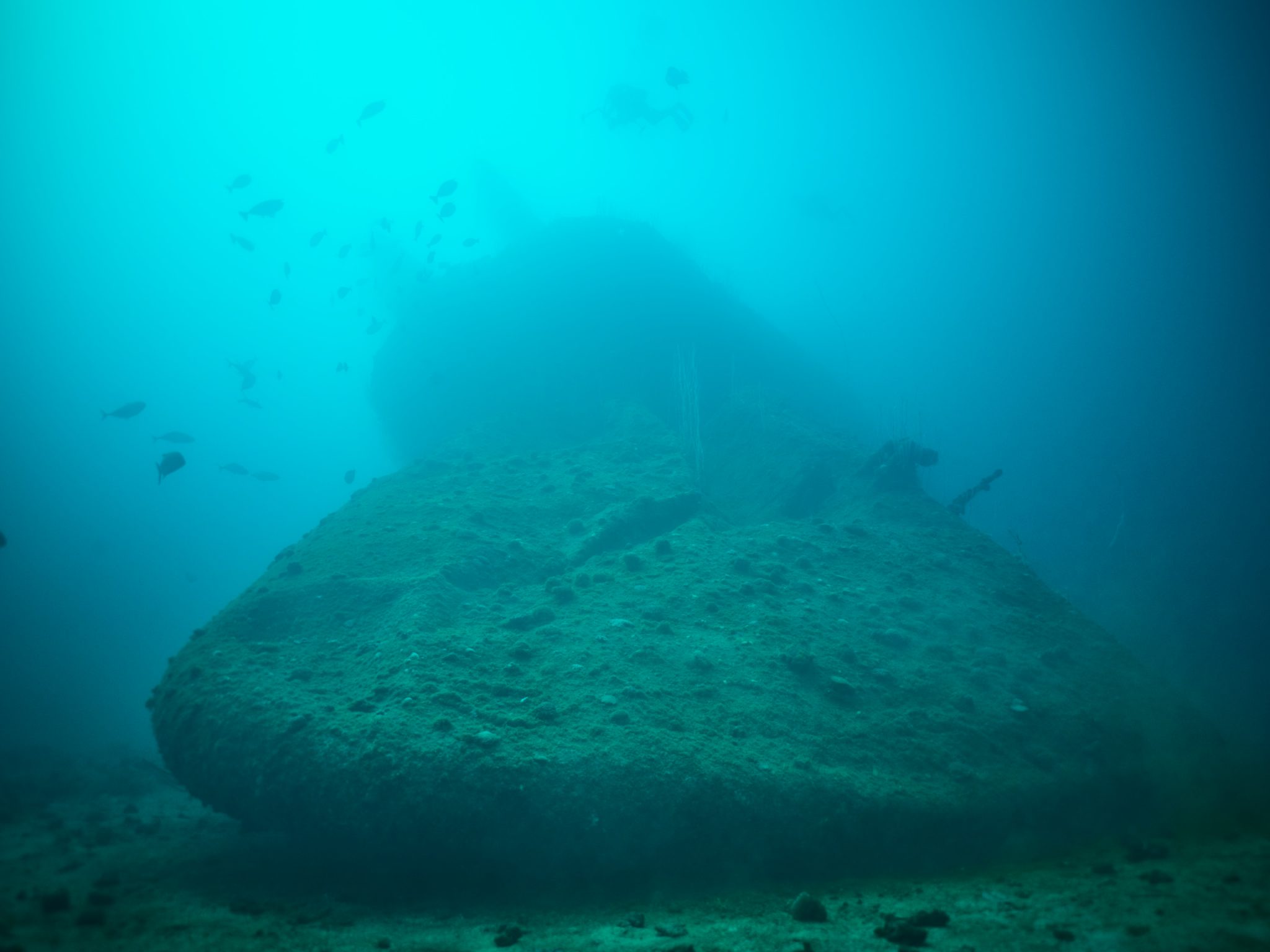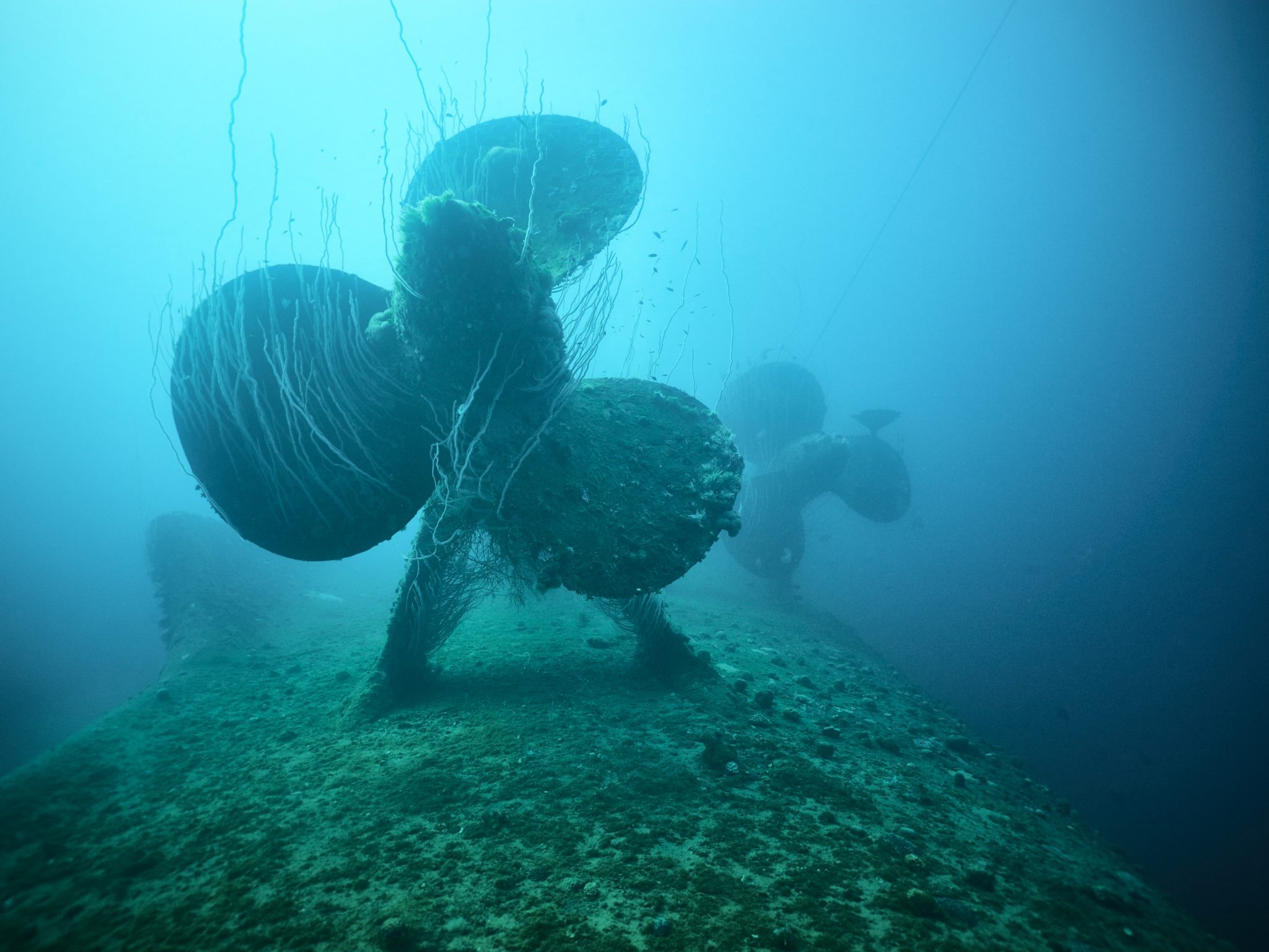 The wreck is upside down and her most prominent features are her four propellers, at a depth of 33.5 meters below the surface.